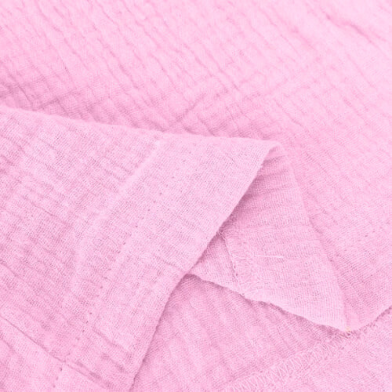 Nuestra muselina color rosa está elaborada 70% bambú y 30% algodón , un tejido ligero, suave y transpirable que protege la piel delicada de tu bebé sin causar irritaciones.
