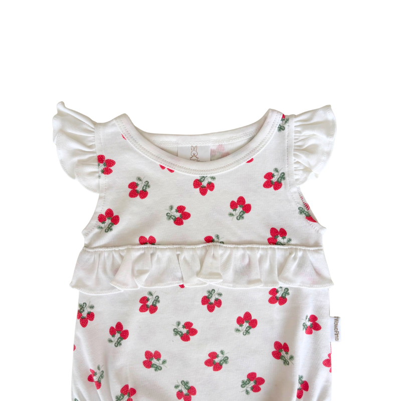 Coqueto overol para bebé en algodón pima color entero blanco con estampado de fresas, diseñado para que tu bebé luzca fresco, cómodo y siempre protegido. Ideal para la piel sensible de los recién nacidos. Perfecto como ropa básica para bebé, parte del ajuar o como un regalo especial, ya que combina calidad premium, comodidad y estilo en una sola prenda.