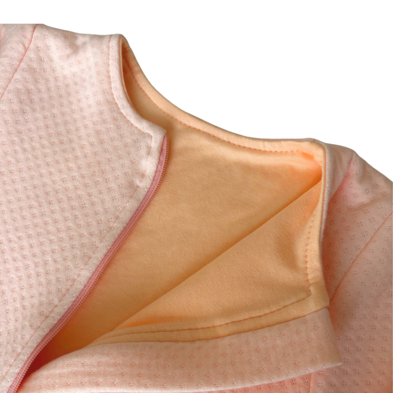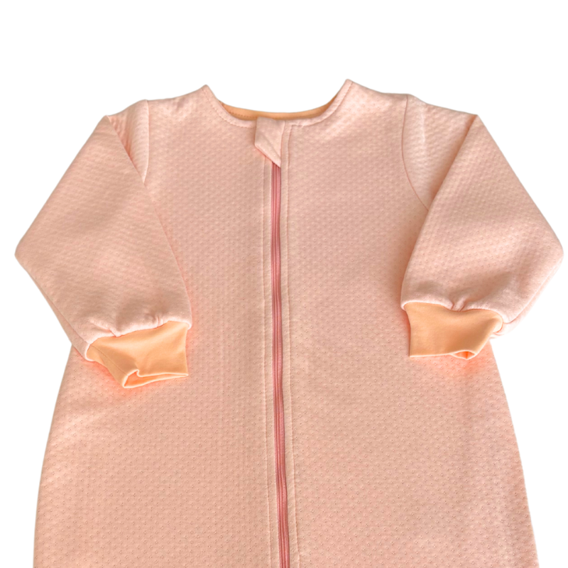 Lindo saquito de dormir color melón, confeccionado con jacquard en el exterior y algodón pima hipoalergénico en el interior. Ofrece un sueño seguro y abrigado para tu bebé durante toda la noche, sin importar cuánto se mueva. Cuenta con doble cierre, ideal para realizar cambios de pañal de manera práctica mientras tu bebé duerme. Además, incluye botitas regulables para cubrir y proteger sus piecitos cuando lo necesites.