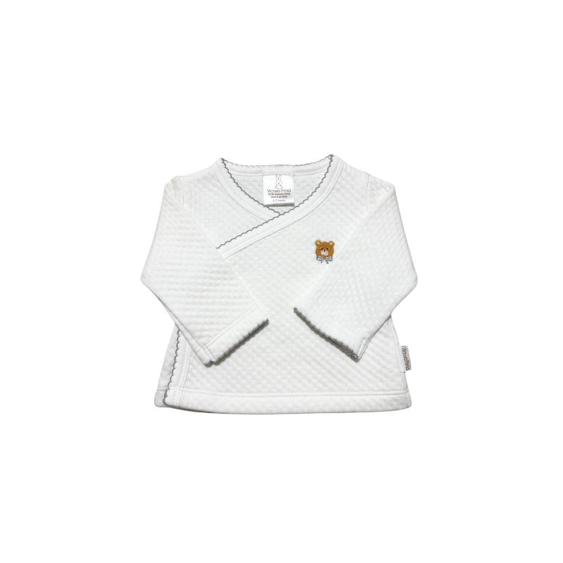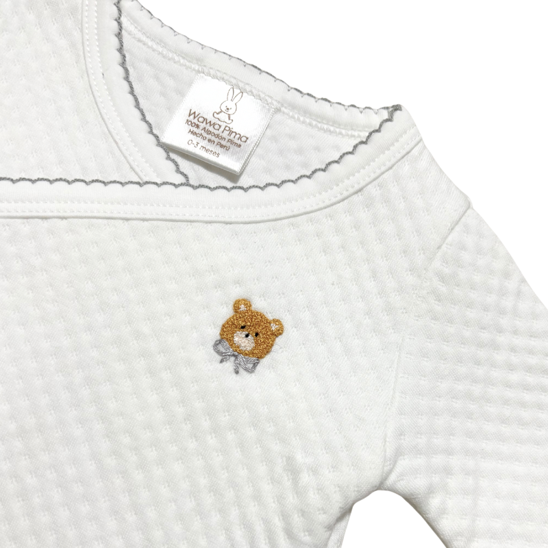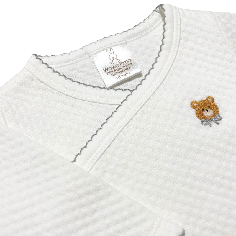 Dale a tu bebé la comodidad y el cuidado que merece con este set de 2 piezas de material jacquard con bordado hecho a mano de osito gris, que incluye chaqueta con bordado, pantalón con pretina ancha. Un ajuar ideal para recién nacido o como regalo de baby shower, que regula la temperatura, siendo perfecto para las salidas y brindando a tu bebé el abrigo justo en cada ocasión.