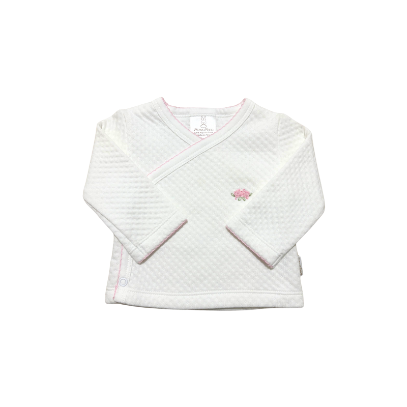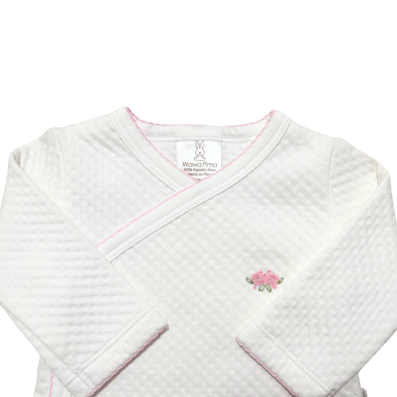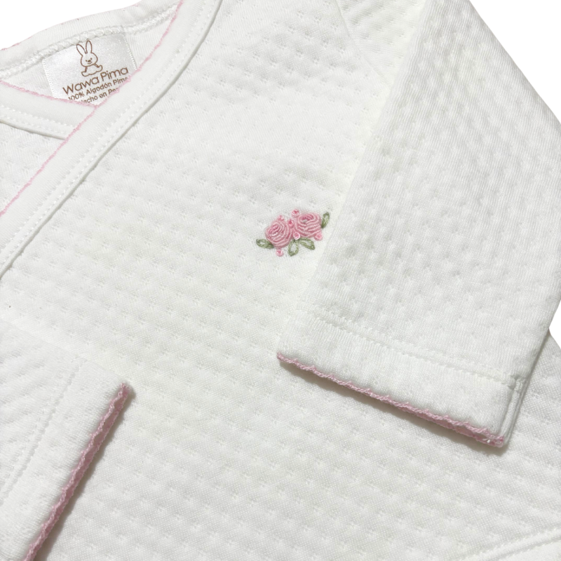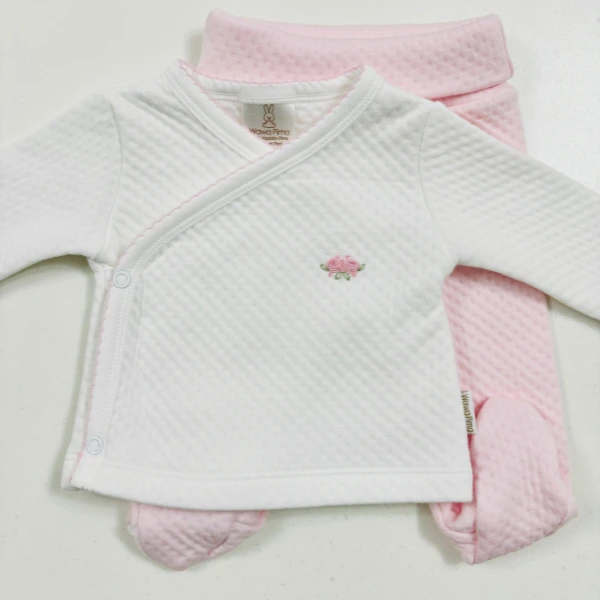 Dale a tu bebé la comodidad y el cuidado que merece con este set de 2 piezas de material jacquard con bordado hecho a mano de rosita rosado, que incluye chaqueta con bordado, pantalón con pretina ancha. Un ajuar ideal para recién nacido o como regalo de baby shower, que regula la temperatura, siendo perfecto para las salidas y brindando a tu bebé el abrigo justo en cada ocasión.
