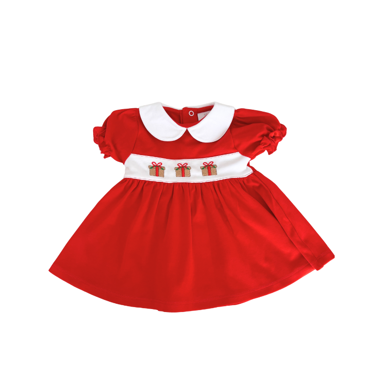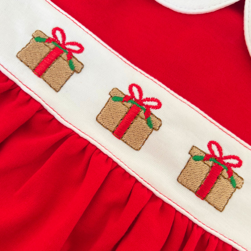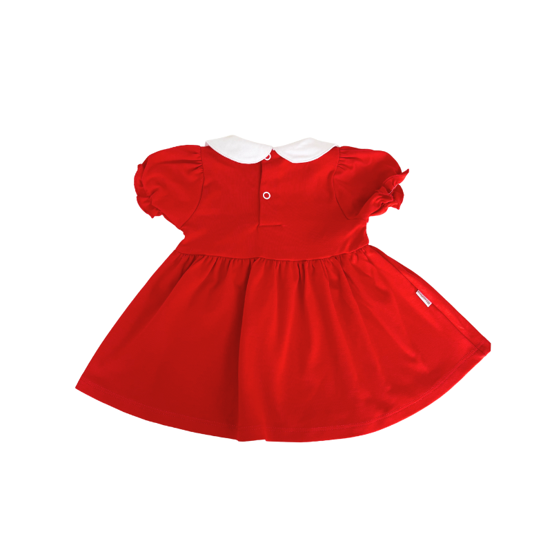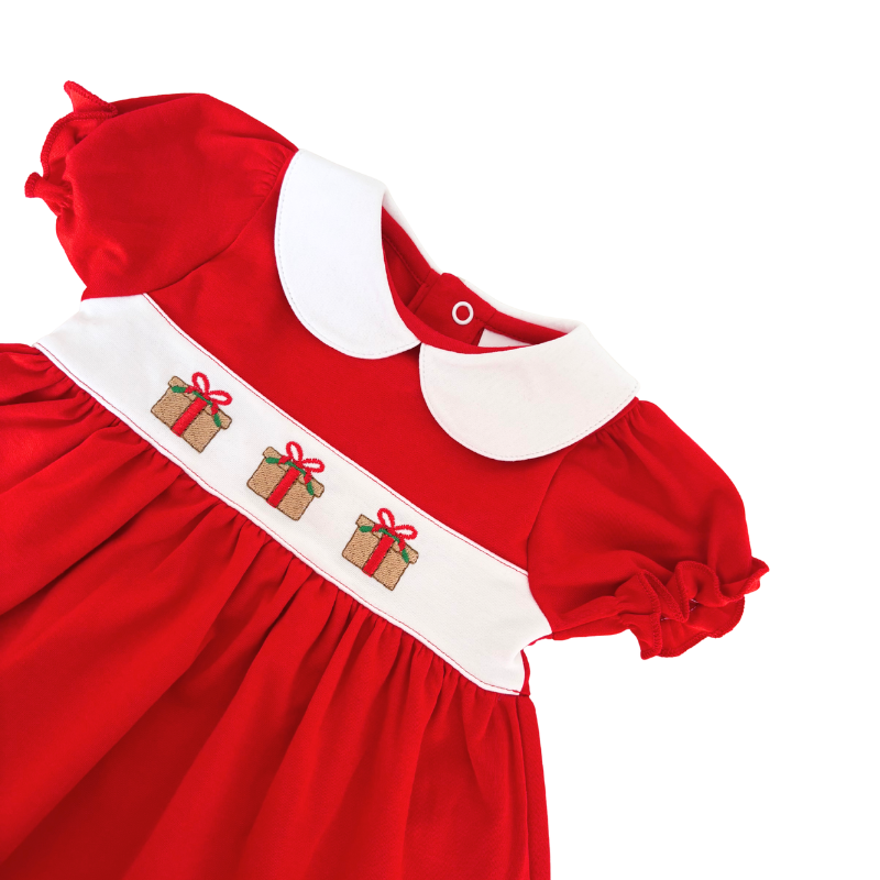 Precioso vestido para bebé color rojo con bordado de navidad hecho a mano, confeccionado en 100% algodón pima, convirtiéndose en un conjunto tierno, cómodo y elegante. Incluye calzón bombacho rojo. Ideal como ropa para recién nacida, para ocasiones especiales o como parte del ajuar, este vestido de bebé en algodón pima ofrece calidad premium y un diseño diferente frente a los vestidos tradicionales para bebés, destacando por ser hipoalergénico, duradero y único.